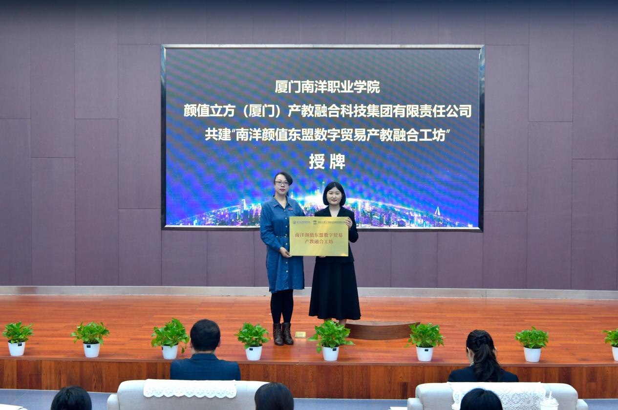 企业向我校颁发“南洋颜值东盟数字贸易产教融合工坊”牌匾