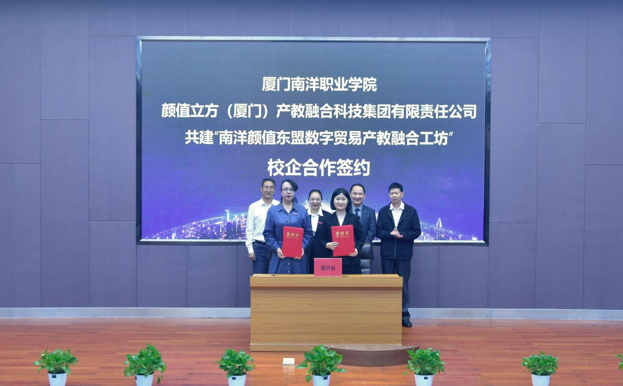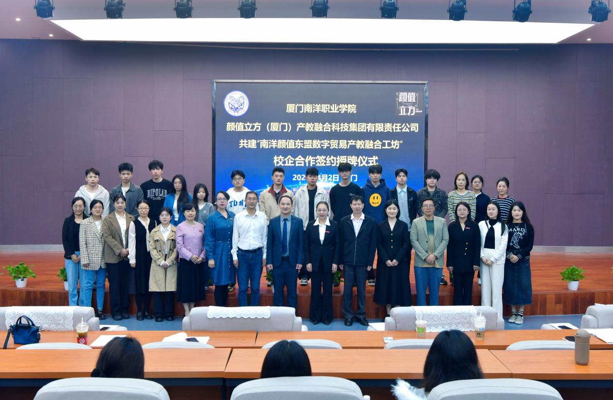 42日上午,我校与颜值立方(厦门)产教融合科技集团有限责任公司(下简称颜值立方集团)签约共建“南洋颜值东盟数字贸易产教融合工坊”,旨在深耕数字贸易产业人才培养,校企携手打造东盟数字贸易产教融合共同体。颜值立方集团董事长李新龙、合伙人杨亚丽、区域经理胡佳颖,我校董事长鲁晓芹、副校长许智坚、校长助理侯红科、经济管理学院/三创学院院长林莉及师生代表参加活动。